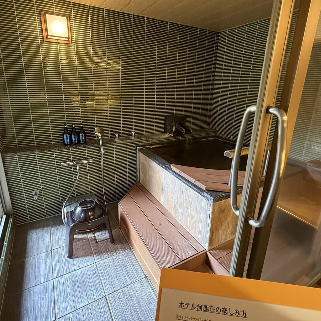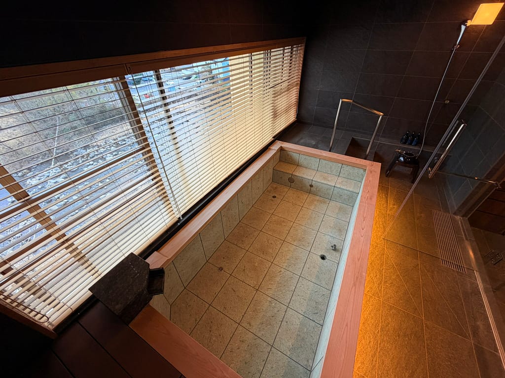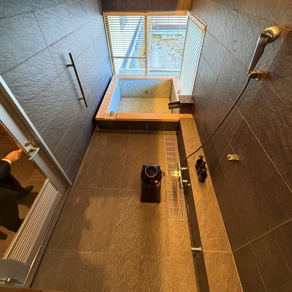 浴室床面と浴槽の高さが同じでなのでご年配の方や岩風呂スタイルで外国人にも人気のある客室です。
